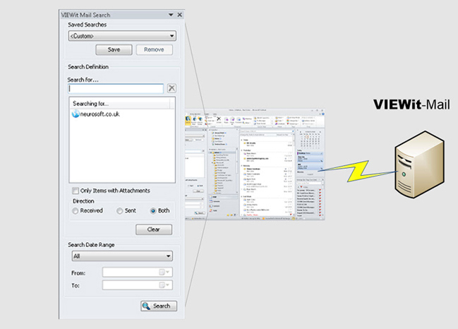 The VIEWit-Mail Outlook search panel that allows a user to define common search templates and access documents that are automatically filed in VIEWit-Mail.